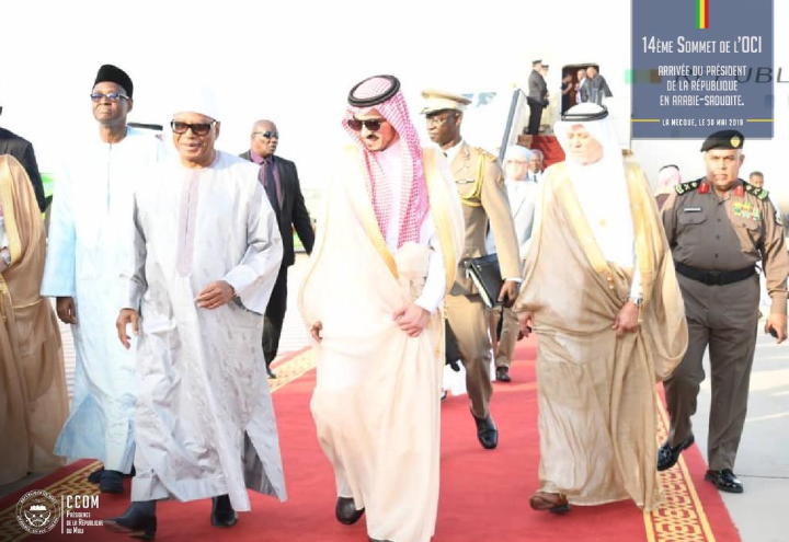 Le Président de la République, Chef de l’Etat , Son Excellence Monsieur Ibrahim Boubacar Keïta, accompagné de son Épouse Keïta Aminata Maiga, Présidente de l’ONG AGIR est arrivé ce 30 mai 2019 à la Mecque, à l’invitation du serviteur des deux Saintes Mosquées, le Roi Salmane Ben Abdelaziz Al Saoud du Royaume d’Arabie Saoudite, pour prendre part à la 14ème Session ordinaire de l’Organisation de la coopération islamique (OCI) prévue les 31 mai et 1 er juin 2019 ( 26 Ramadan 1440). La session sera présidée par le gardien des deux saintes mosquées le roi Salman bin Abdulaziz Al Saud. Le thème de la session ordinaire du Sommet islamique est « main dans la main vers l’avenir ».