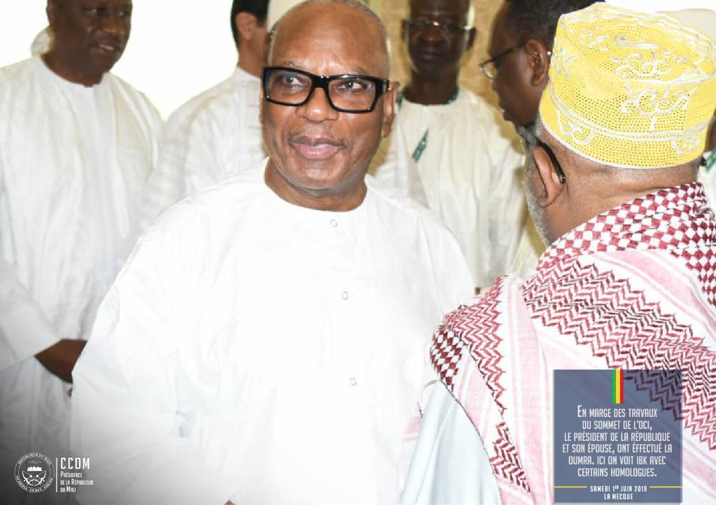 Le Président de la République, Chef de l’Etat, Excellence El Hadj Ibrahim Boubacar Keita accompagné de son Épouse Keita Aminata Maiga , Présidente de l’ONG en marge du 14 è Sommet de l’OCI, a accompli la Oumrah à la Mecque. Hier vendredi 31 mai 2019 ,dernier jummah du mois béni de ramadan , le couple présidentiel a prié face à la Kaaba à partir du 14 étage de l’hôtel royal de la Mecque. Le Président de la République, a fait des prières et des bénédictions pour la paix , la réconciliation, la stabilité au Mali, une bonne pluviométrie, une bonne fin du mois de carême musulman. Le Président de la République, a également prié pour un apaisement définitif du climat social pour le développement socio-économique rapide du Mali. Sur les lieux on pouvait noter la présence d’autres chefs d’Etat et de leur épouse ( Nigeria, Tchad, Senegal).