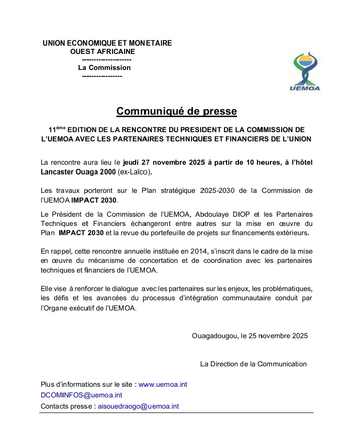 Le Président de la Commission de l’UEMOA, Abdoulaye DIOP et les Partenaires Techniques et Financiers échangeront entre autres sur la mise en œuvre du Plan IMPACT 2030 et la revue du portefeuille de projets sur financements extérieurs.