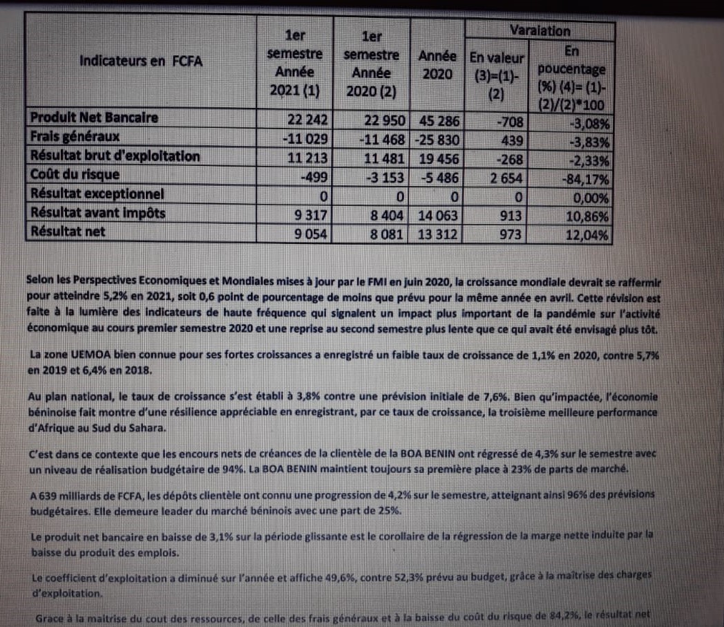 La BOA affiche une hause de 12,04% au 1er semestre 2021 par rapport à l’année 2020