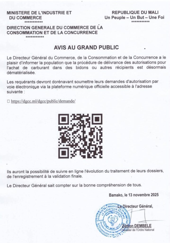 (CROISSANCE AFRIQUE)-Au Mali, le Directeur Général du Commerce, de la Consommation et de la Concurrence a communiqué, à travers un avis au public publié le 13 novembre 2025, à informer la population entière que la procédure de délivrance des autorisations nécessaires pour procéder à l’achat de carburant, que ce soit dans des bidons ou autres types de récipients, connaît désormais une transformation significative car elle est entièrement dématérialisée.