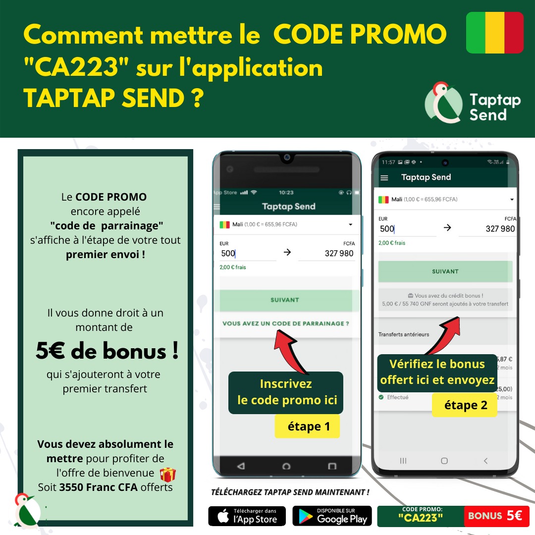 Pour découvrir notre service, télécharger l’application depuis l’Appstore ou Playstore, inscrivez-vous en moins d’une minute et bénéficiez de 5€/$ de bonus, soit 3.280 FCFA XOF, vers les compte Orange MONEY au Mali avec le code promo « CA223 ». Vos proches reçoivent le dépôt instantanément dans les portefeuilles orange money et peuvent le retirer si ils le souhaitent partout au Mali ( de Kayes à Tombouctou). Pour profiter du code bonus, regardez cette affiche ci – dessous