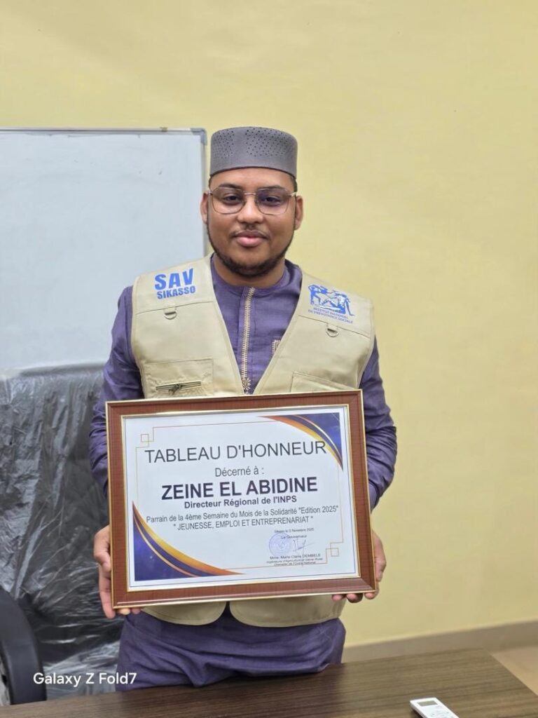 (CROISSANCE AFRIQUE)-Au Mali, le Directeur régional de l’Institut National de Prévoyance Sociale (INPS) de Sikasso, M. Zein El Abidine, a été honoré par un tableau d’honneur qui lui a été remis avec fierté par Mme la Gouverneure de la région.