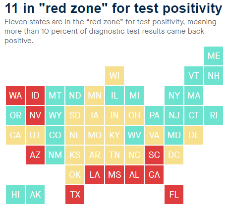 11 États américains ayant plus de 10% de tests d’acide nucléique positifs ont également été désignés comme « zones rouges ». (Photo : The Daily Beast)